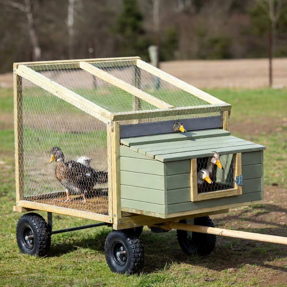 A duck tractor is a portable coop that moves around your yard or pasture. It allows ducks to forage for bugs, grass, and weeds while keeping them safe from predators.
