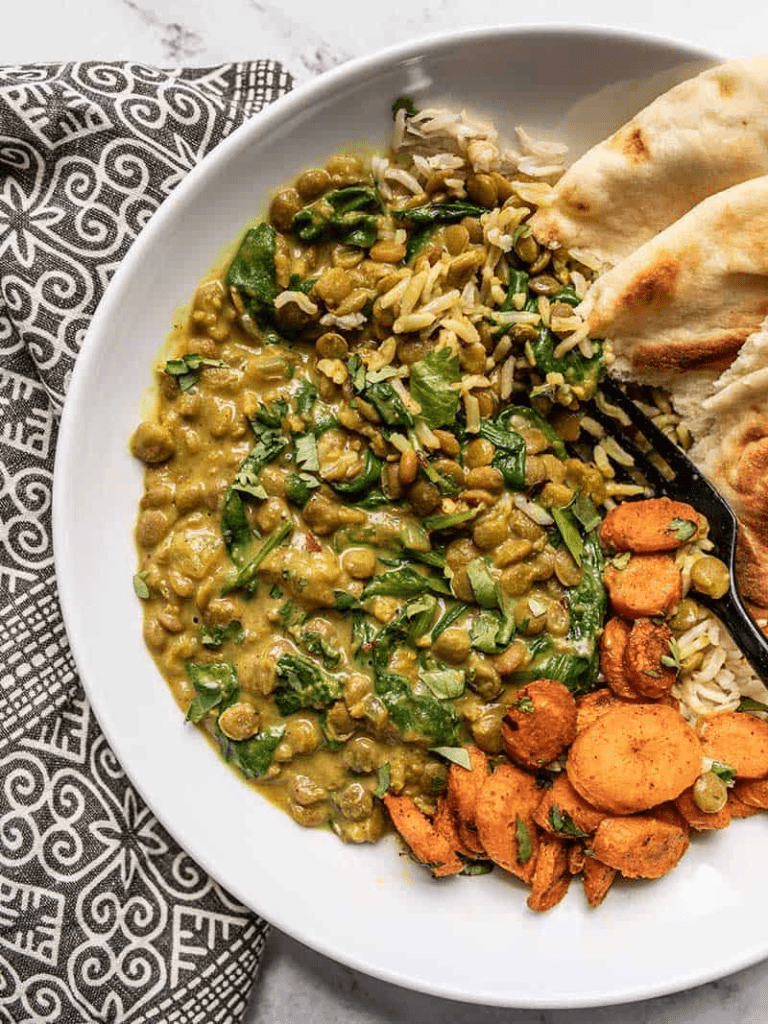 Simmer red lentils with garlic, turmeric, ginger, and coconut milk. Stir in fresh spinach at the end.
