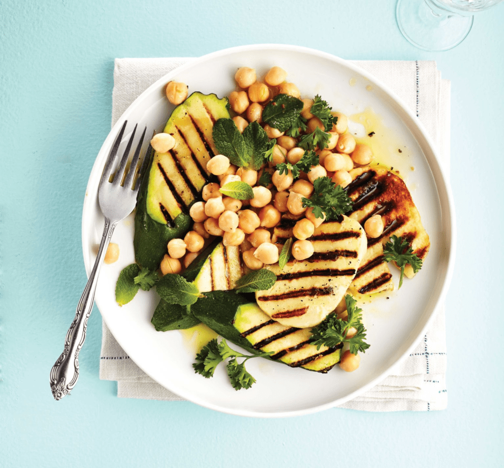 Chickpeas are excellent for gut health thanks to their fiber content. Halloumi, a firm Mediterranean cheese, adds satisfying protein.