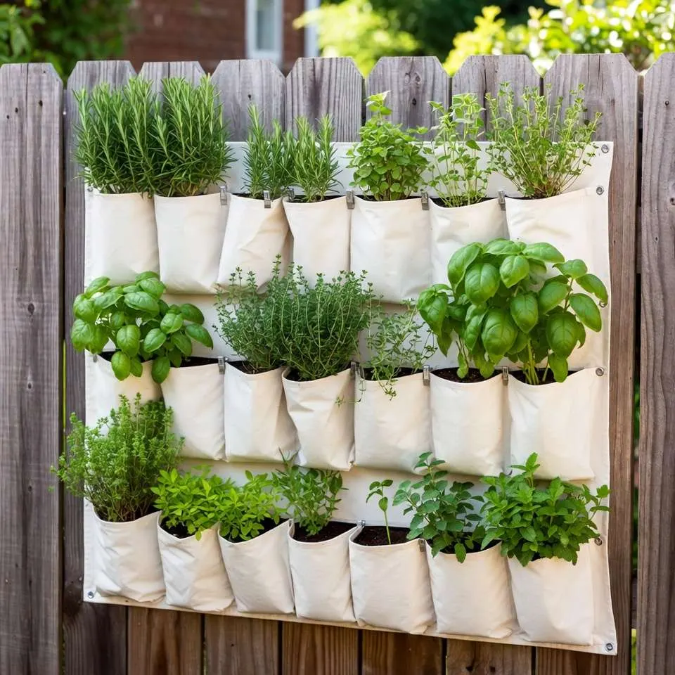 A vertical herb wall turns an empty fence or wall into a living display. Fabric pocket planters, mounted containers, or wooden pallets all work surprisingly well.