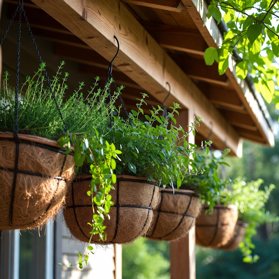 Trailing herbs like thyme and oregano spill over edges beautifully. Mint grows well here too, and hanging baskets help contain its aggressive roots.