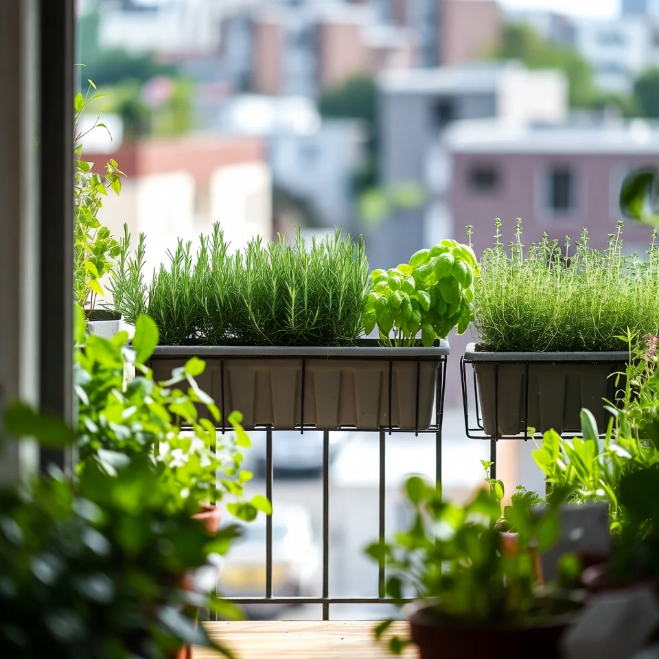 Rail planters hang securely while keeping floor space open. Even narrow balconies can support several herbs this way.