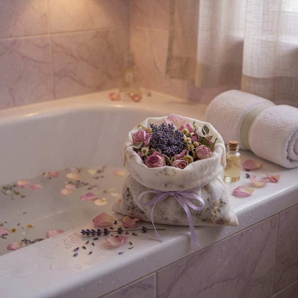 You can use dried flowers like lavender, rose petals, or chamomile, combined with oats or Epsom salt. Place them in a muslin bag or even a clean cloth, then let them infuse in warm water.