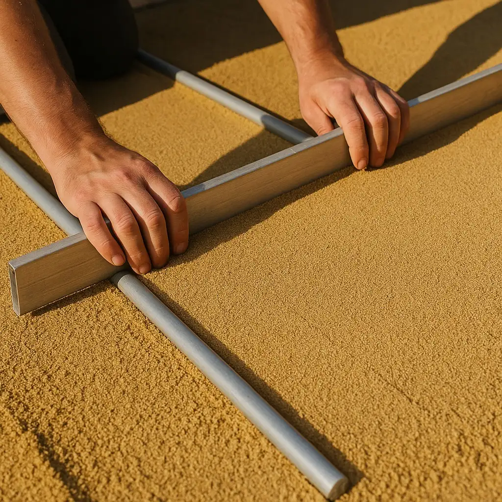 - Use two parallel pipes (like 1-inch PVC) as guides and drag a straight board or 2×4 across them to screed the sand perfectly level.
