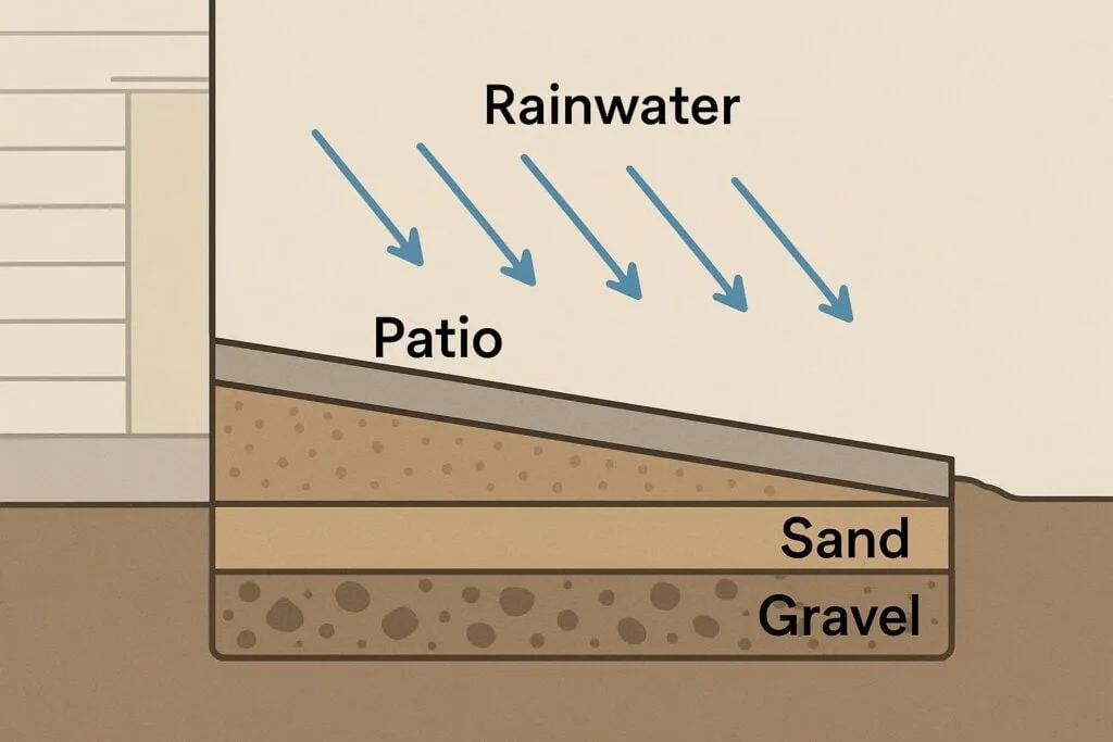A perfectly flat patio might look appealing, but water has its own agenda. If it can’t flow away, it’ll sit, soak, and eventually cause shifting or moss growth between your pavers.