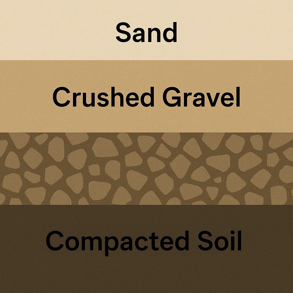 - Crushed stone or gravel: This forms the backbone of your base. It should be coarse, angular gravel, not round stones that shift over time.