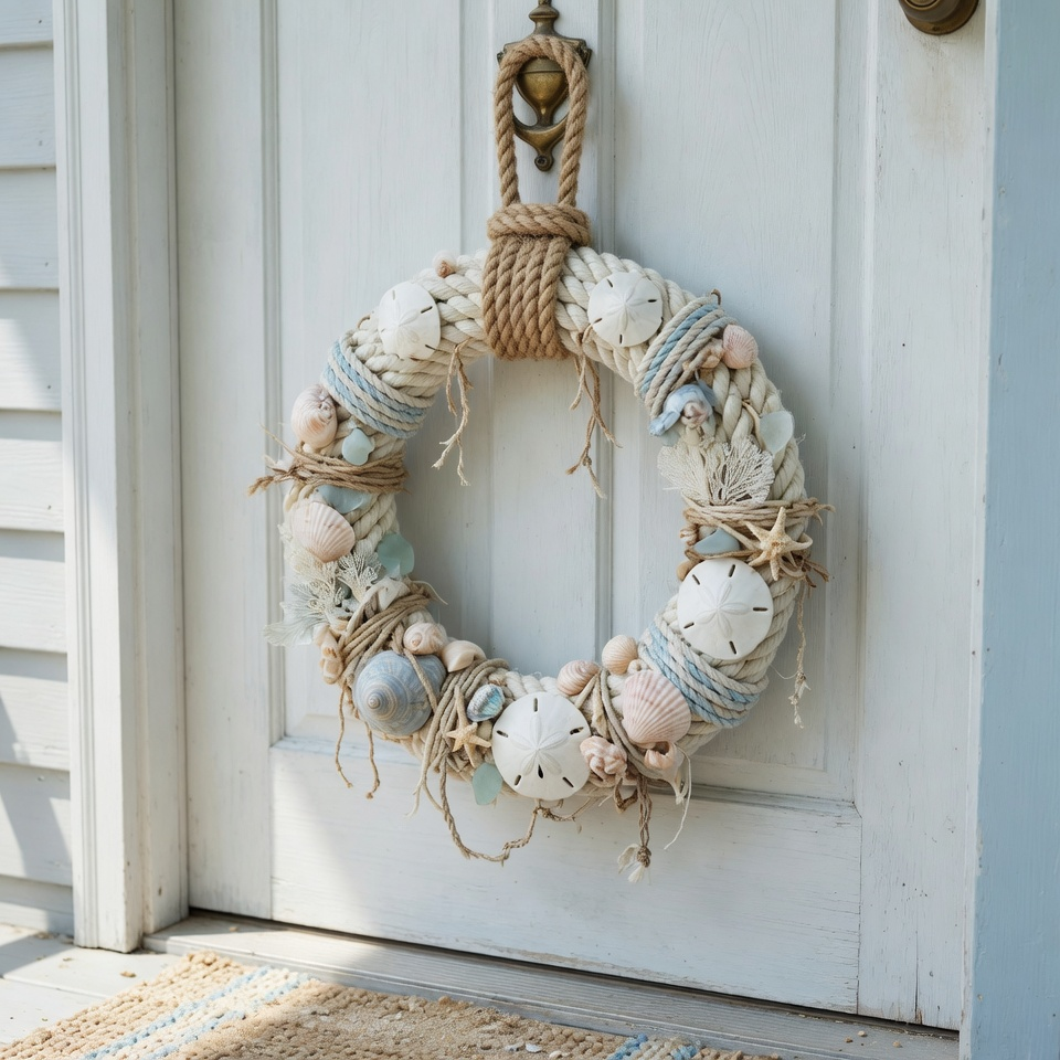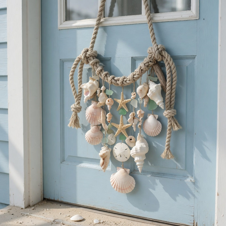 A rope and seashell hanger brings instant coastal energy—even if you’re miles away from the ocean. The textures do all the work: rough rope, smooth shells, maybe a bit of driftwood.