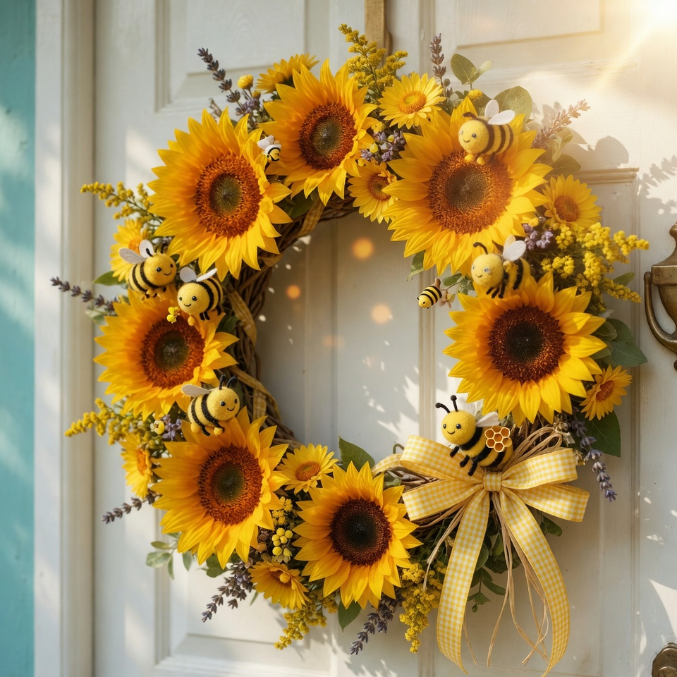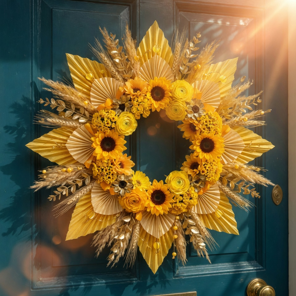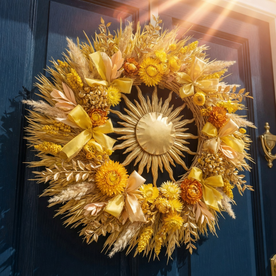 A sunburst wreath uses radiating shapes—often in yellow, gold, or natural tones—to mimic sunshine. It instantly brightens your door, even on cloudy days.