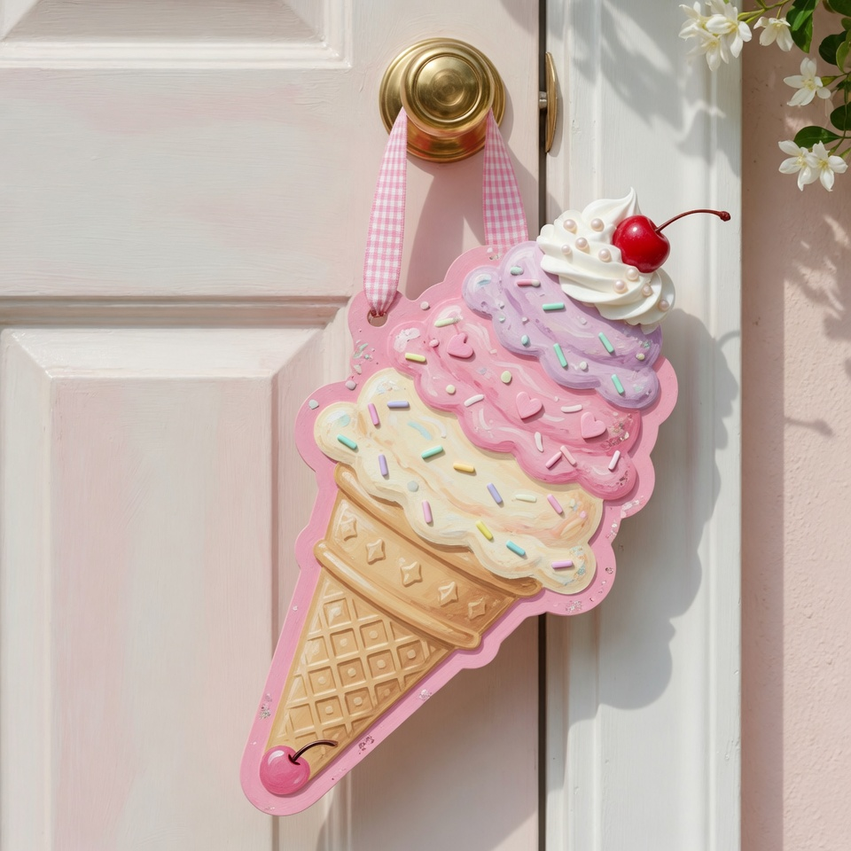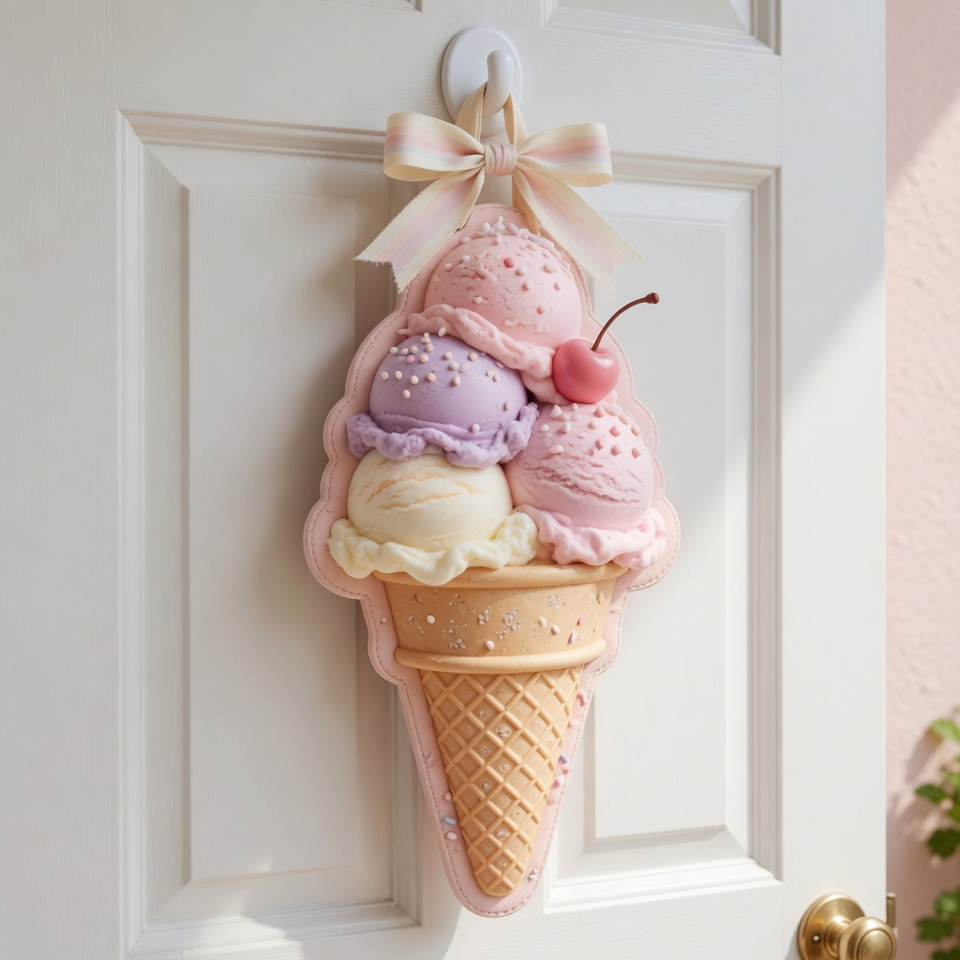 An ice cream-themed hanger brings those childhood summer memories right to your doorstep. Think pastel colors, soft shapes, and a playful vibe.