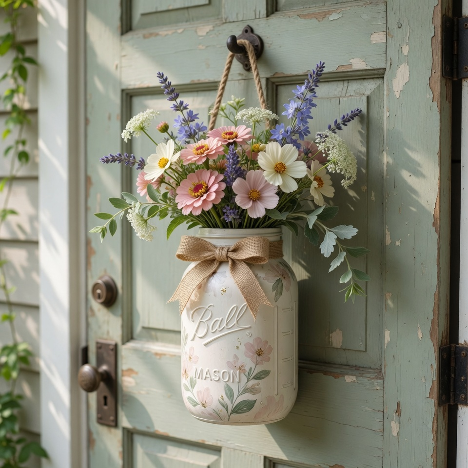 A painted mason jar with flowers gives your door that handmade, thoughtful touch. It’s perfect if you love DIY projects and want something unique.