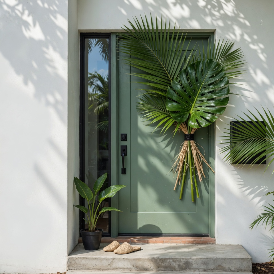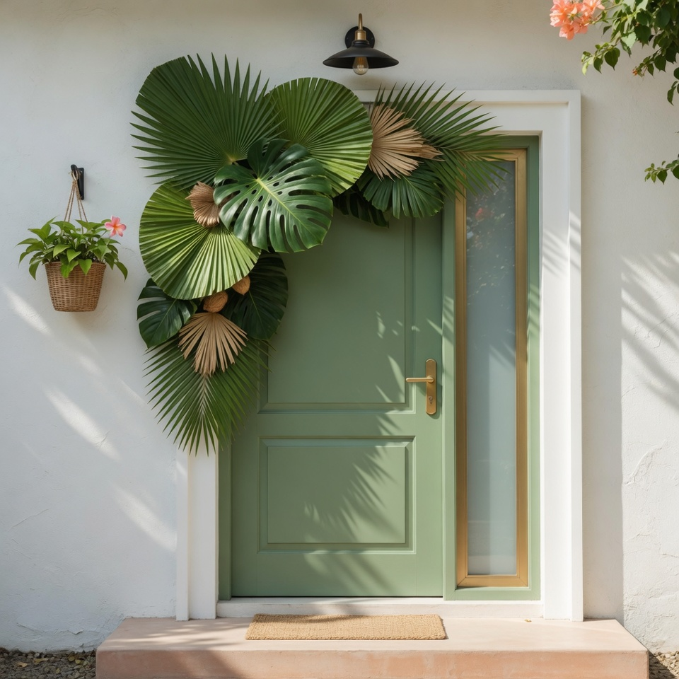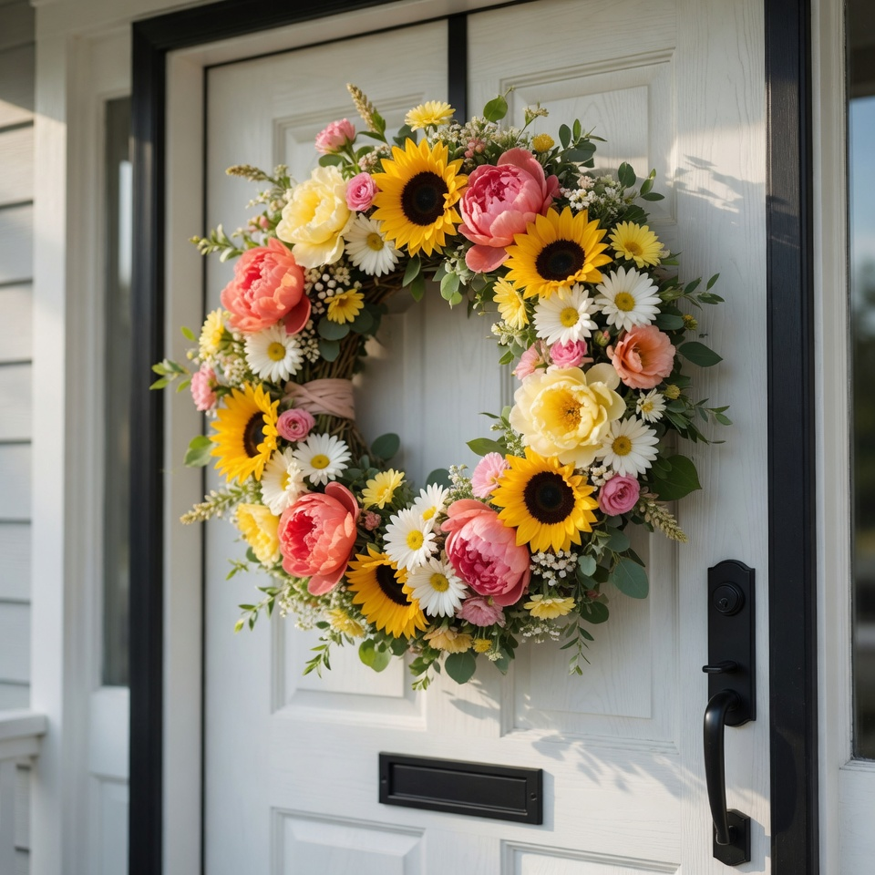 Think sunflowers, daisies, peonies, or even wildflowers if you love that relaxed, natural look. Bright yellows, soft pinks, and fresh greens instantly wake up your doorway.